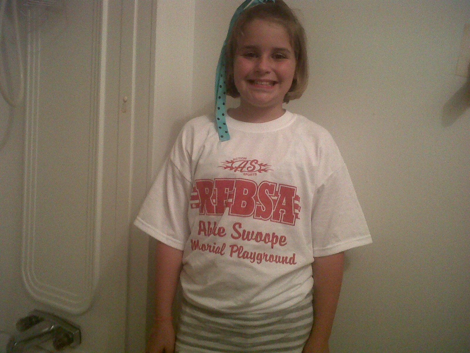 Two years ago God received a precious Angel.. Hannah's friend from her softball team passed away at a very early age. They were happy 8 year olds, Hannah loved Abbie so much, they were best friends! The baseball/softball association has been raising money to build a playground at the ball parks in memory of Miss Abbie. Last week we played Hannahs old team and seen these shirts, I spent my only 5 dollars on her shirt. It may have not been logical but in my heart it was!the cost of the shirt goes to the memorial playground. We will always remember Abbie Swoop. As Hannah always says, they will be friends forever...